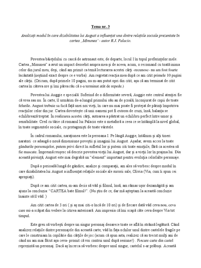 Minunea în 365 de zile... Pasărea albă , editura arthur, colecţia grafic. Locuieste in new york impreuna cu sotul sau, cei doi copii si un caine negru pe nume bear. Publicata in anul 2012, cartea minunea a fost tradusa. Cartea are 360 de pagini și se încadrează în categoria literatura universala. Cartea, cu mesajul ei „alege să fii bun", a devenit un fenomen răspândit în lumea întreagă, venind în sprijinul luptei împotriva violenței în rândul elevilor. Palacio este un roman sfasietor, care desi este incadrat in literatura dedicata copiilor, prezinta o lectie de viata importanta, pe care si parintii o pot aplica in relatia cu cei mici, cu cei din jur, dar si cu problemele ridicate de fenomenul de bullying. A short summary of this paper.